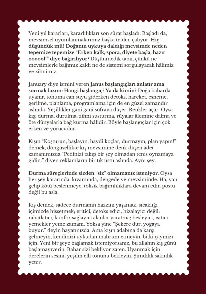 @ebeselen ‘in bir postuymuş bu, Ece Aybike Ala da ona credit vermiş. Okuyunca zihnimde bir şeyler uyandı. Tüm doğa uyurken, koşturuyor olmayı istemiyorum ben de sanırım. O yüzden, kendimi çok da yormadan, processler için ufak adımlar atıp akışını takip edeceğim sadece. Süreç bize ne gösterecek göreceğiz. Hazır olmadan, hazır hissetmiş gibi davranmayı reddediyorum.